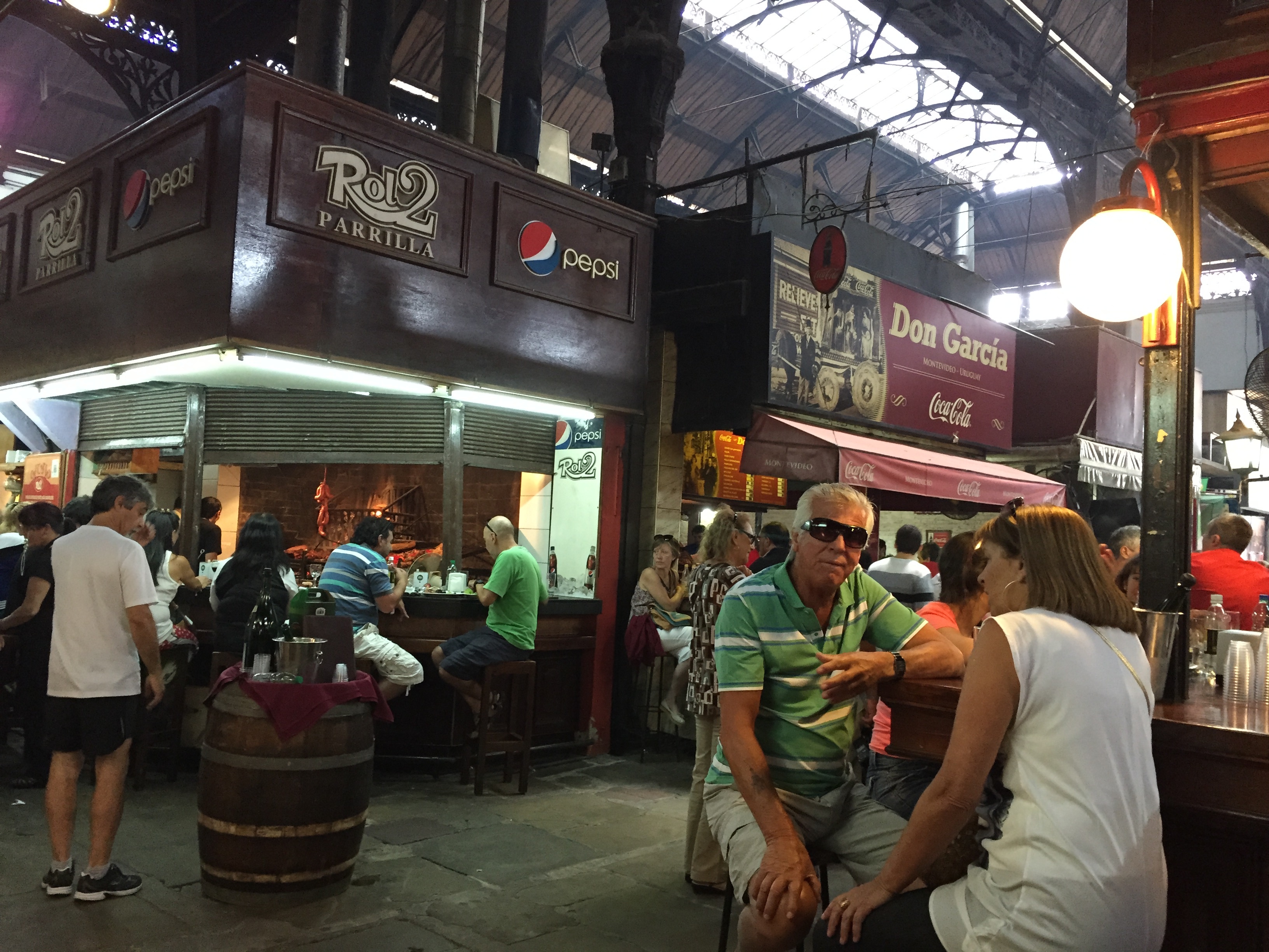 Anyway, I hadn’t had lunch, so after a few tastes of wine combined with sun exposure (the sun is brutal here) and another bout with a very bad sunburn, I was feeling a little woozy and thought a snack might be in order. I thought I would stop by one of the small stands on the way back to the ship and have an empanada. But, as I was walking along, I saw some smoke rising from a building close to the ship and smelled meat cooking, so decided I would check it out. When I entered the “pavilion”, I realized that I was in the famed BBQ section of Montevideo that many people on the ship had been talking about. There were many BBQ restaurants there….I don’t know how many…maybe a dozen all lined up. Each one had an open kitchen where you could see meat being cooked on a grill with flames leaping up all around the meat. It looked intriguing and smelled great! It’s was settled…I was in!